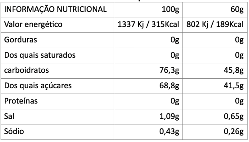 Ingredientes: Açúcar, água, xarope de glucose, xarope de frutose, pectina (vegan), cloreto de sódio, ácido cítrico, óleo de coco (cobertura da goma).