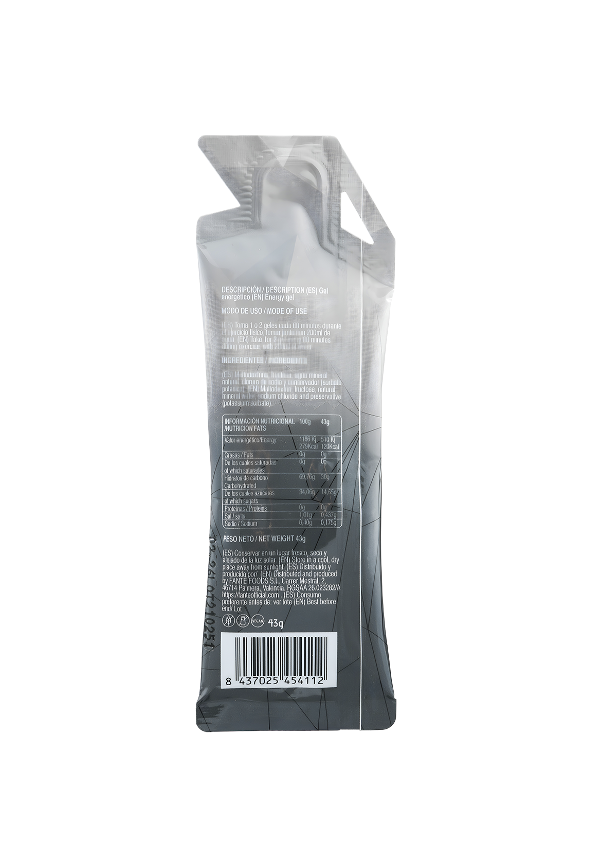 O gel energético (30CHO) Glut 5 Off é o único gel no mercado, sem aromatizantes, sem conservantes e incluindo apenas o que é necessário para o seu desempenho de acordo com a evidência científica atual.