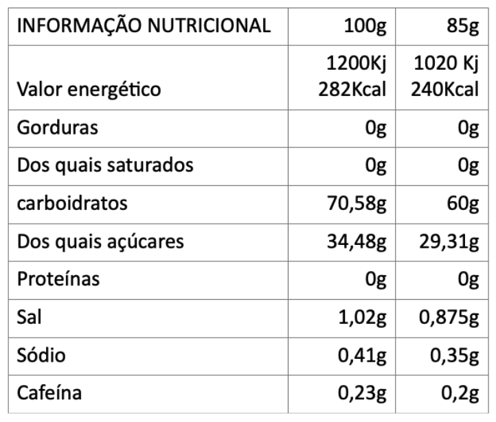 Ingredientes: Maltodextrina, frutose, sumo de laranja natural, água mineral, cloreto de sódio e cafeína anidra.