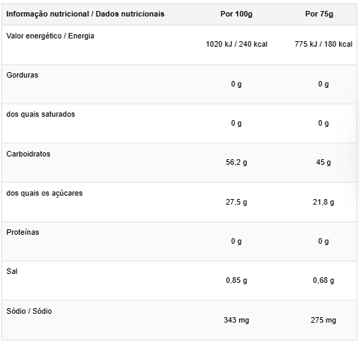 Ingredientes: Sumo natural de laranja (33%), maltodextrina, frutose, água mineral, minerais (cloreto de sódio, citrato de potássio, citrato de cálcio, citrato de magnésio) e sorbato de potássio.
