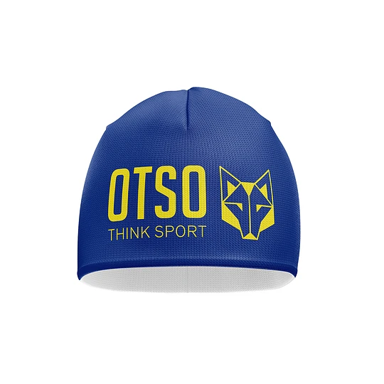 Gorro azul com texto e logotipo amarelo OTSO THINK SPORT