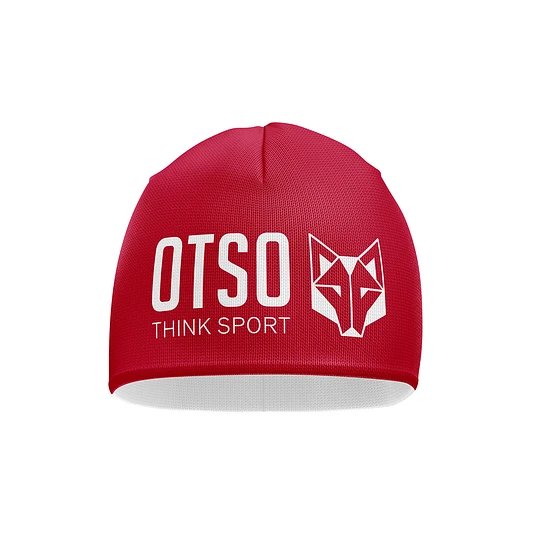 Gorro desportivo vermelho com texto OTSO THINK SPORT e símbolo de lobo branco.
