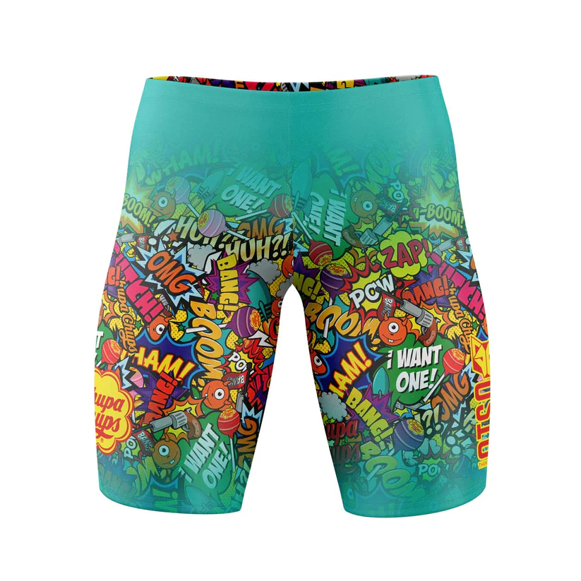 Calções de banho coloridos com padrão de banda desenhada e fundo turquesa