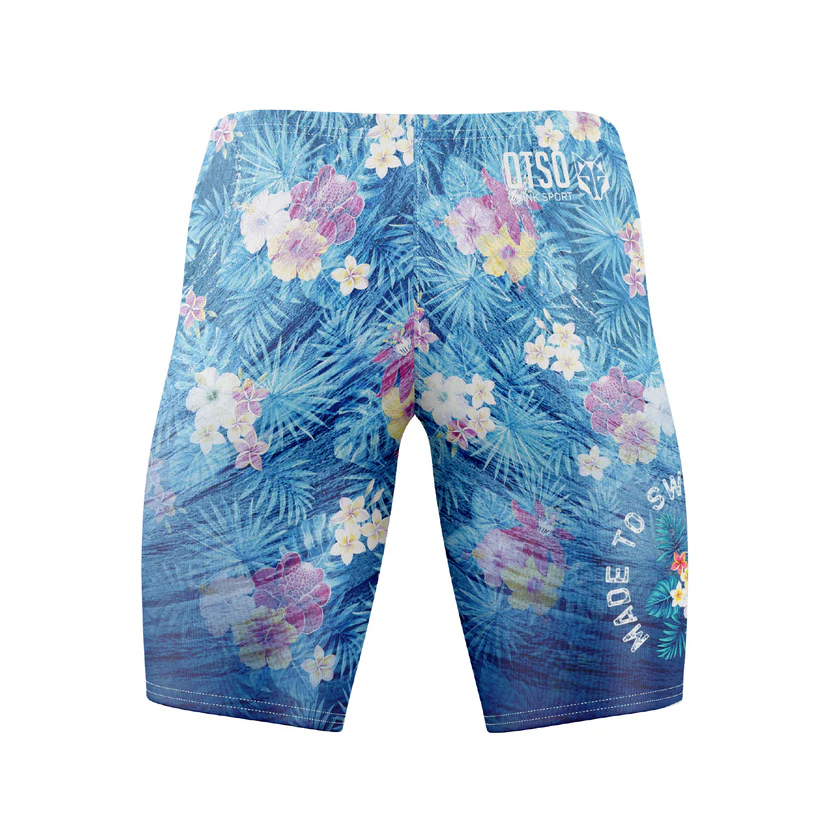 Calções de banho com padrão floral azul e texto branco nas laterais